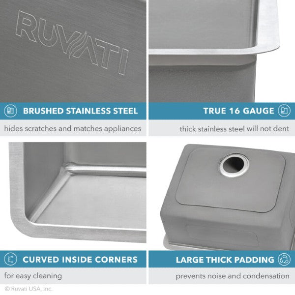 The Modena collection from Ruvati combines large rectangular shape sinks with gently curved inside corners and edges for a perfect combination of form and function. The sloped bottom of the sink ensures perfect water drainage, and the curved insider corners make it easy to clean. The sink comes with a decorative drain cover that hides the drain while allowing water and waste to flow through freely. This neat design makes the Modena sink a perfect fit for the everyday kitchen.